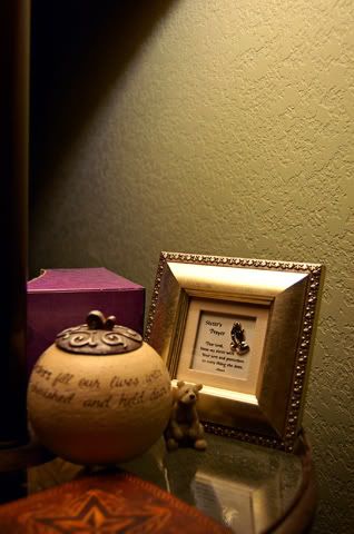 This is stuff on my reading lamp table. Sister candle from Kelley a couple Christmases back, sister prayer from Jesi this Christmas, and the little bear was given to me by Paul I don't know how many years ago.